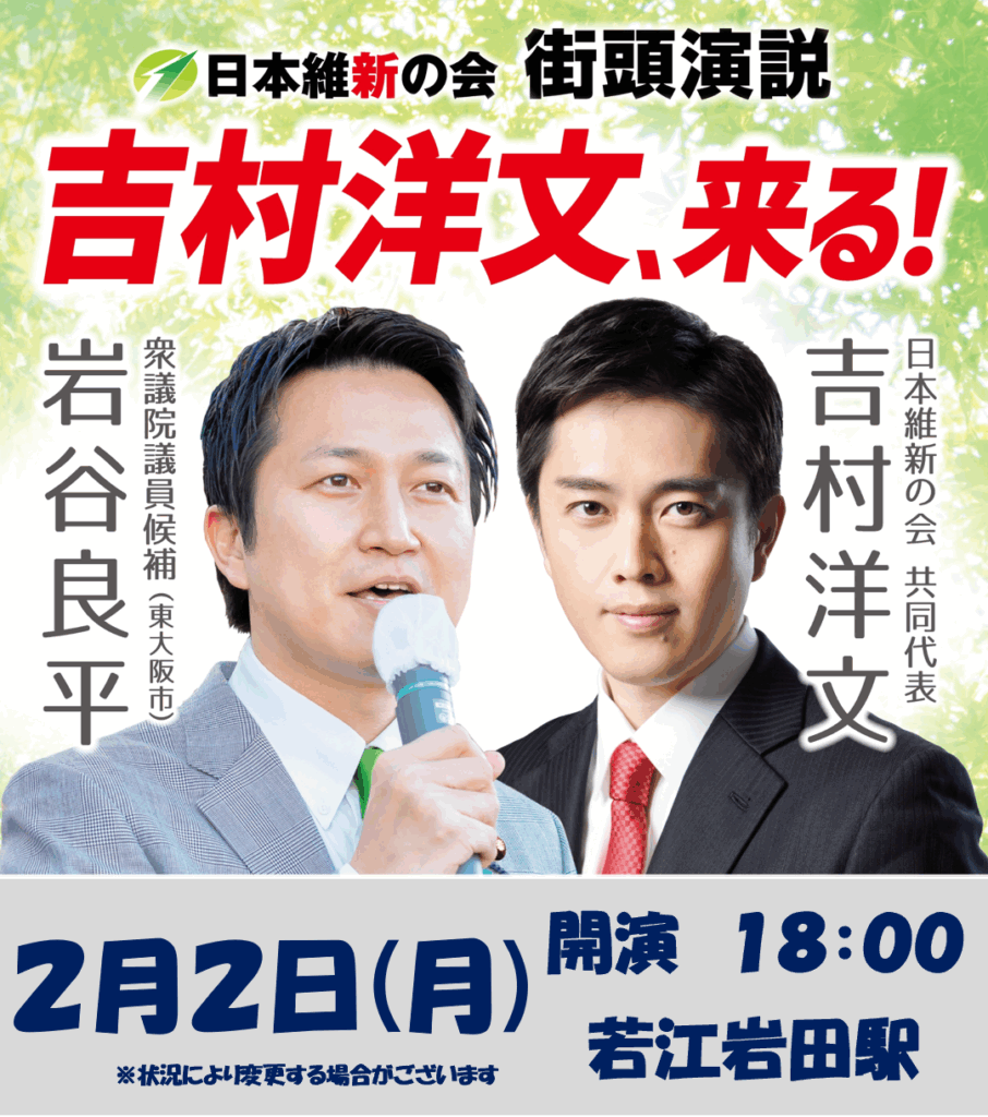 2/2(月)吉村洋文、来る!街頭演説(若江岩田駅18:00)