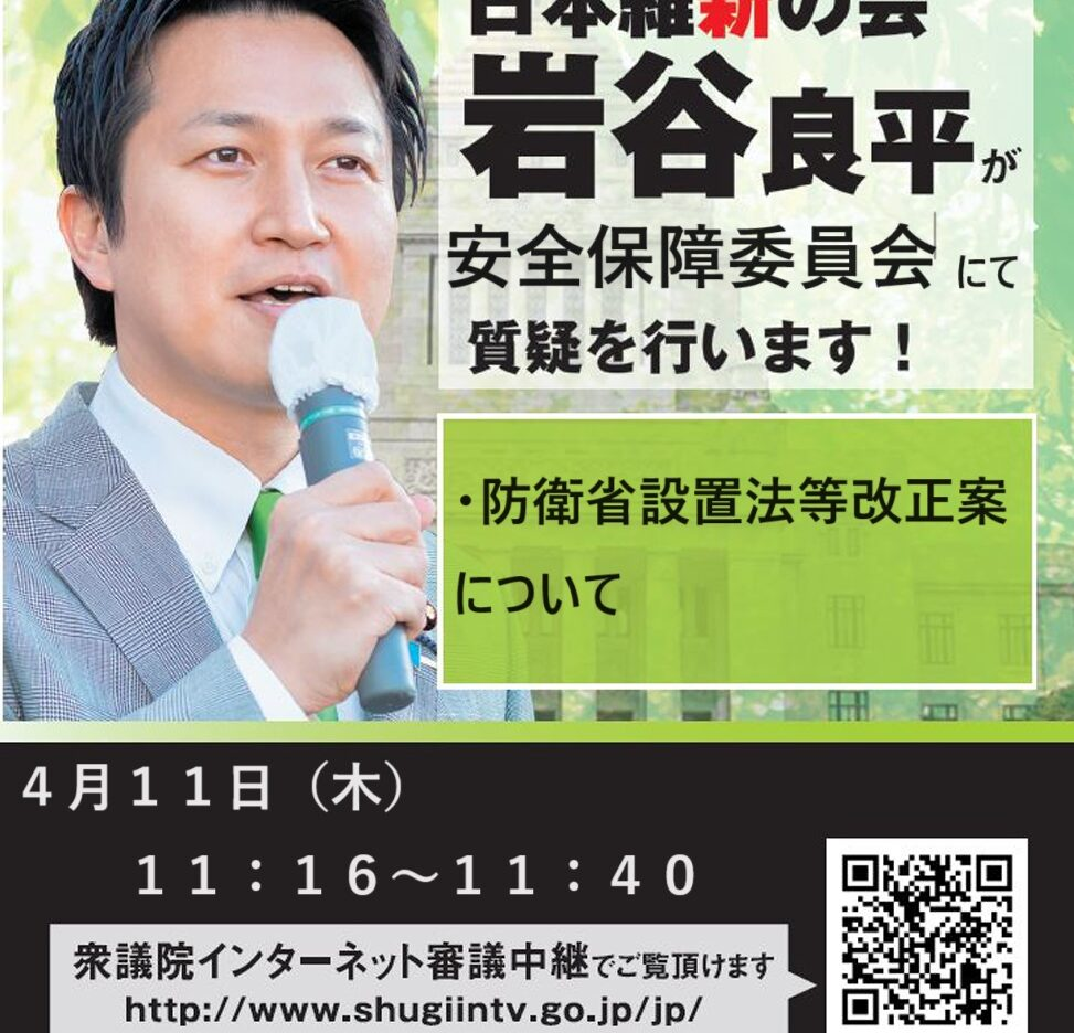 4月11日(木)11:16~11:40 安全保障委員会にて質疑をいたします。