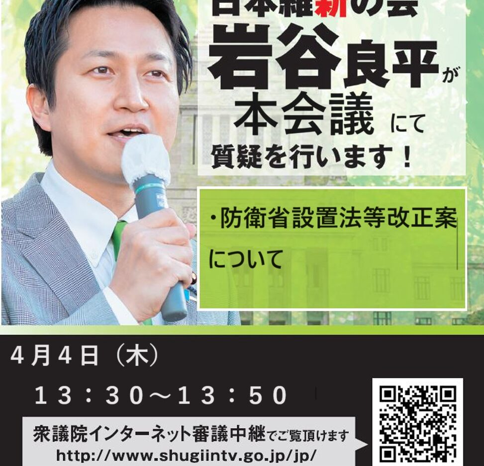 4月4日(木)13:30~13:50頃 本会議にて質疑をいたします。