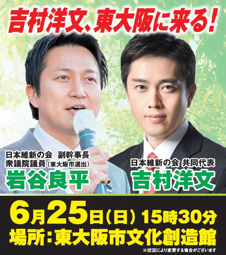6/25 国政報告会のご案内(日本維新の会 吉村共同代表来場) 投稿日 2023.05.17 更新日 2025.12.10 著者 espo カテゴリー お知らせ 日時 6/25(日) 15:30 場所 東大阪市文化創造館 東大阪市御厨南二丁目3番4号 上記の日程で国政報告会を開催致します。 たくさんのご来場お待ちしております。 前の記事一覧へ次の記事