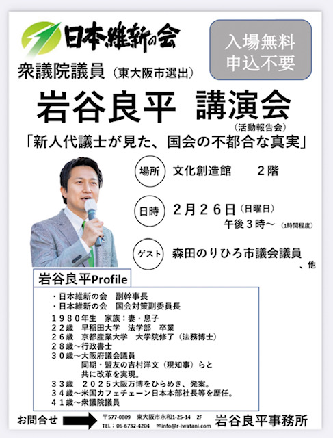 2/26 国政報告会のご案内 投稿日 2023.02.06 更新日 2025.12.10 著者 espo カテゴリー お知らせ 日時 2/26(日) 15:00~ 場所 文化創造館2階 東大阪市御厨南2-3-4 上記にて国政報告会を開催致します。 たくさんのご来場お待ちしております。 前の記事一覧へ次の記事